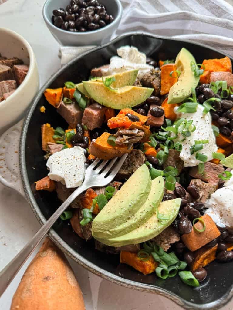 Add the cooked black beans and steak pieces to the sweet potato skillet. Stir to combine.